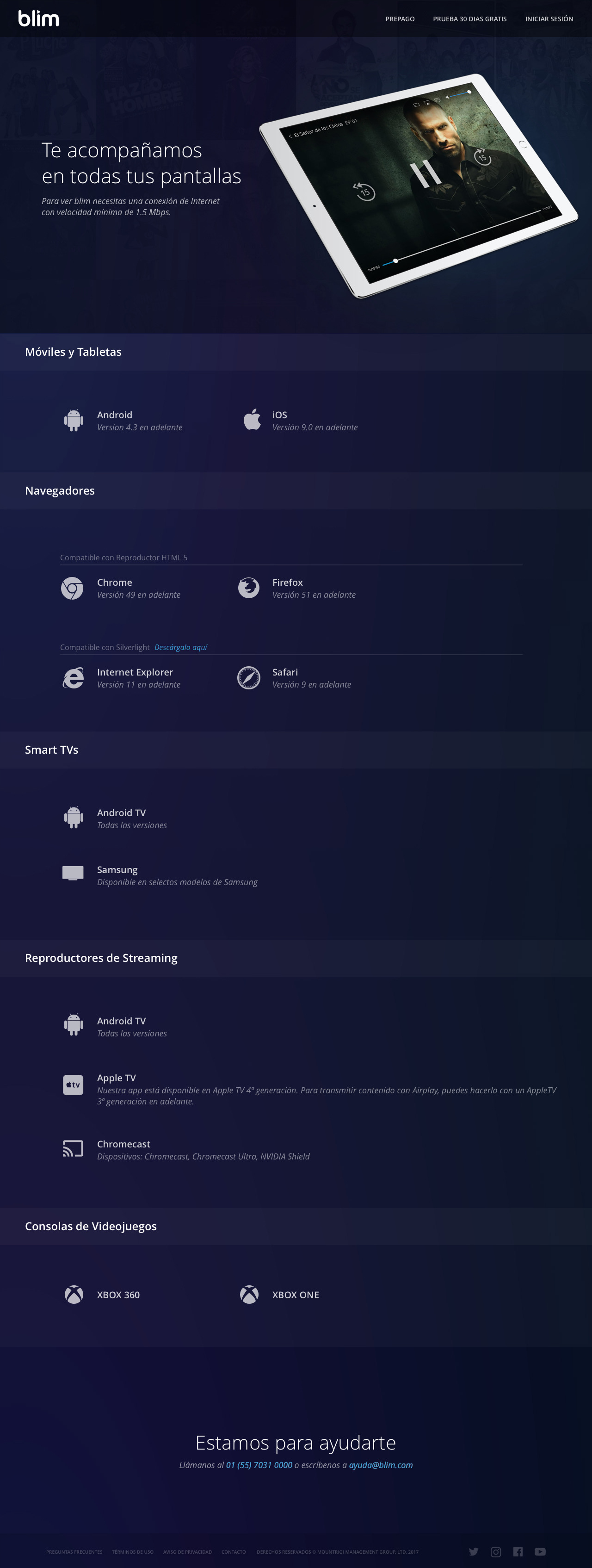 The new Devices Page for blim informs the user with a list of supported devices and required technical specs before trying out the service.